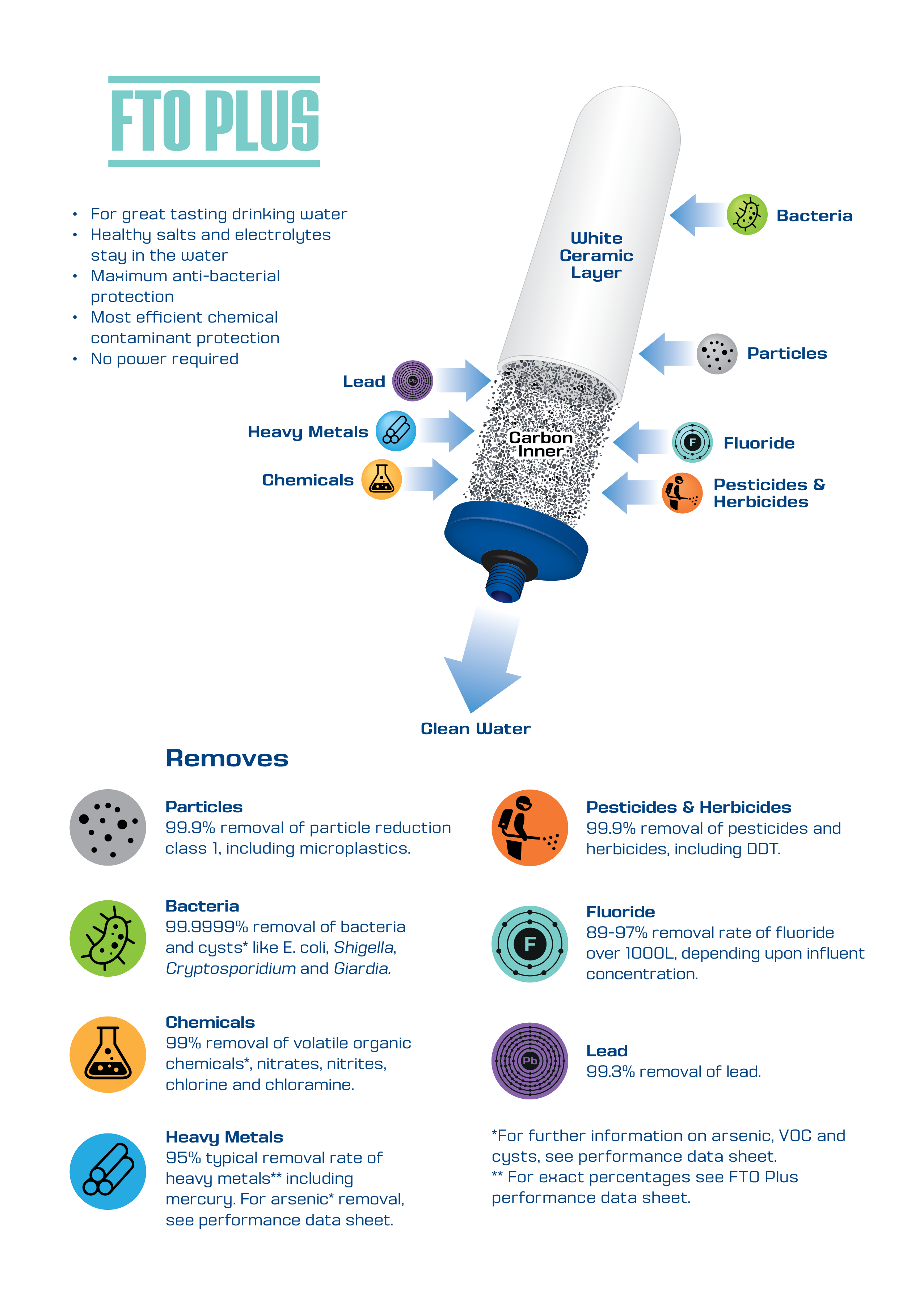 Coldstream FTO+ filters are a significant advancement in water filtration technology offering elimination of bacteria, cysts, parasites, chemical contaminants, pharmaceuticals, heavy metals, and a strong reduction of NITRATES and FLUORIDE.